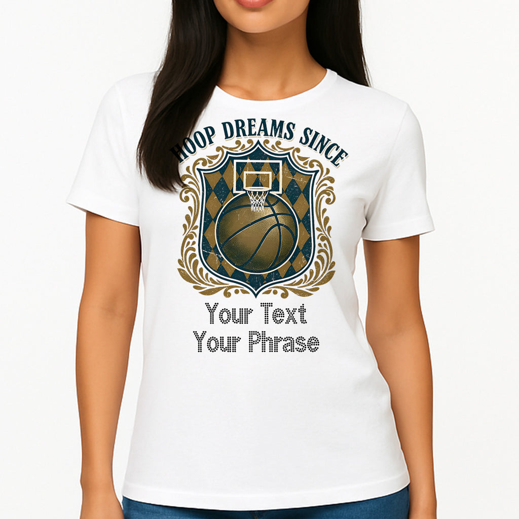 Custom Women's T-Shirt - Basketball DTF Print with Personalized Rhinestone Text